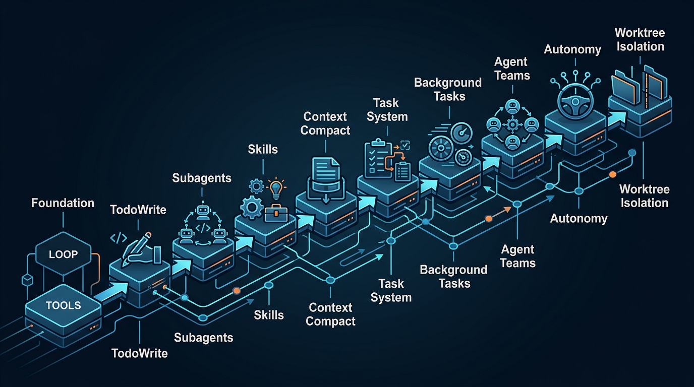 也就是说,它不是直接扔给你一个“大而全代理框架”,而是把 Claude Code 这类 agent 的核心机制,一层一层拆给你看。