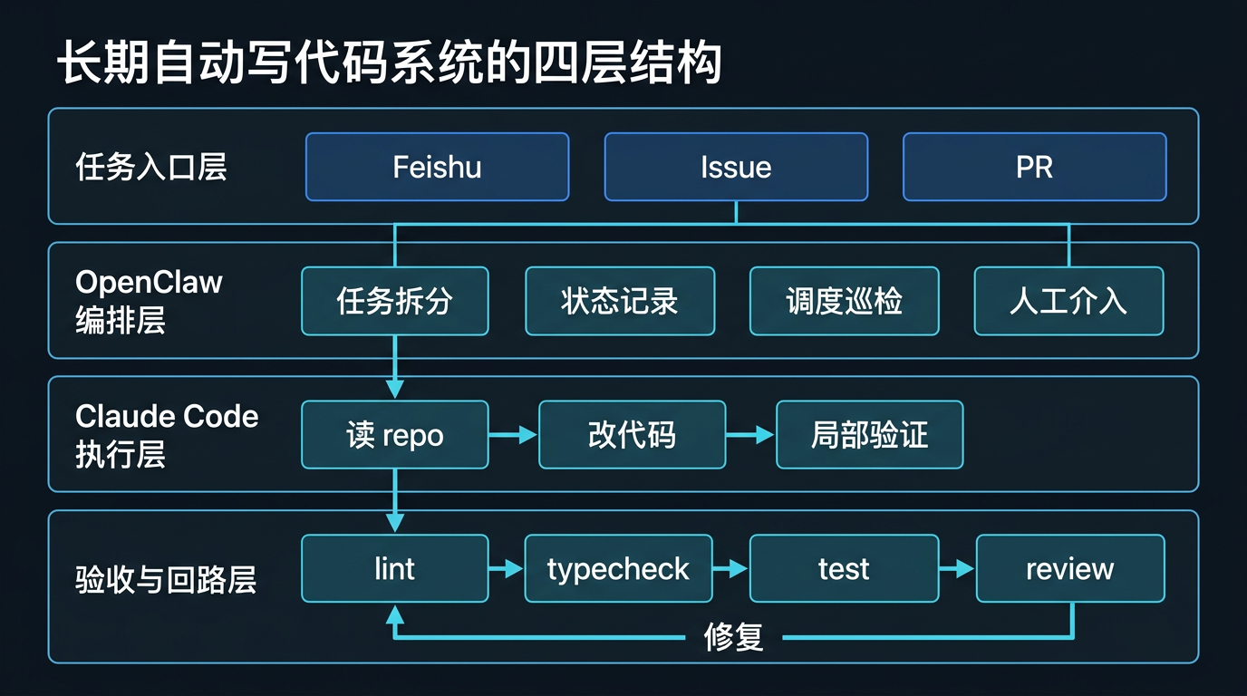 如果我要用 OpenClaw + Claude Code 搭一个长期自动写代码系统,架构应该怎么设计?