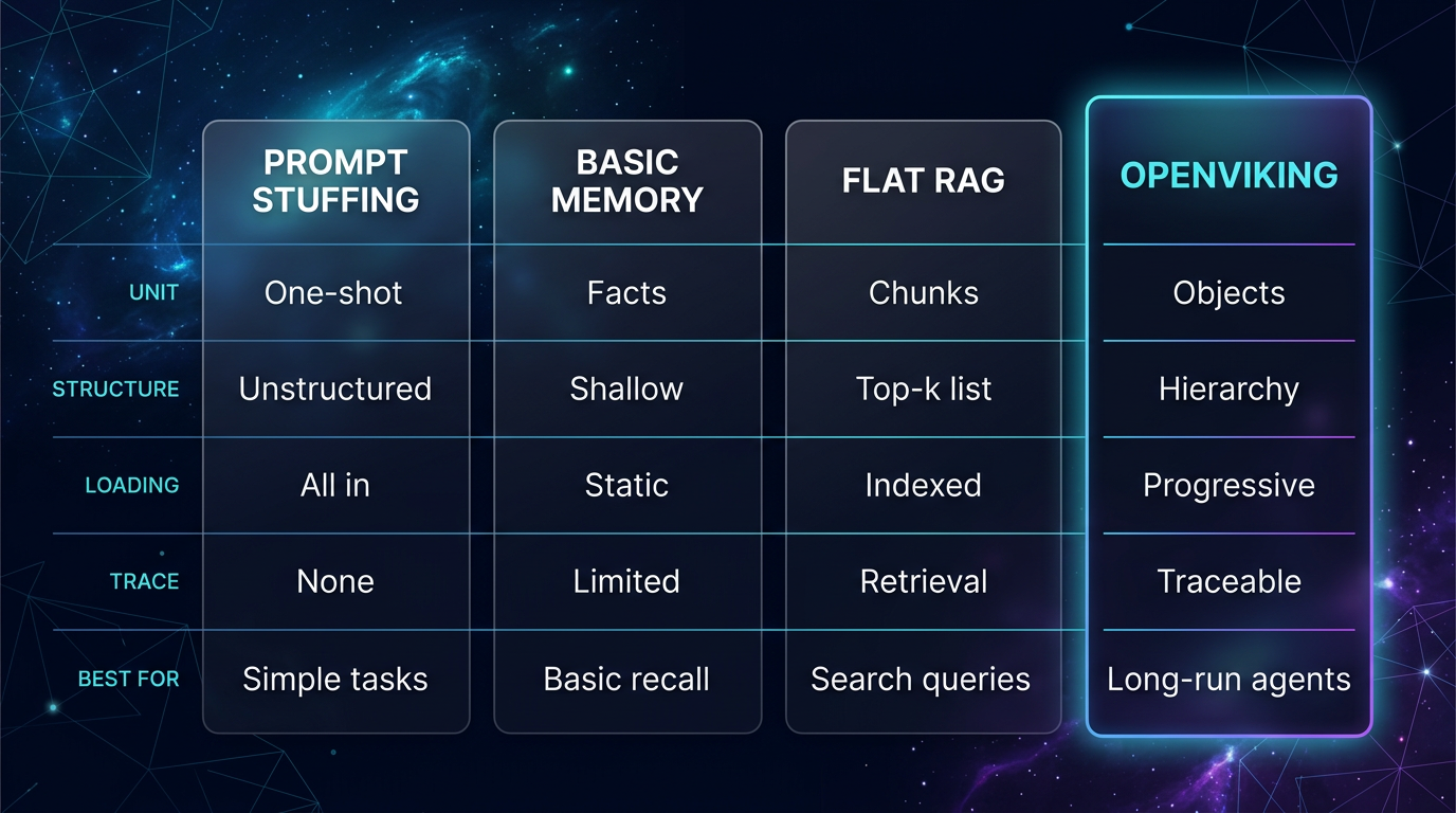 图:它和普通 memory / RAG 的差别,不是“多一个检索层”这么简单。普通方案更像把信息拼起来临时用,OpenViking 则把上下文的组织方式、层级关系和装载顺序一起定义了,所以更像底座,不像补丁。