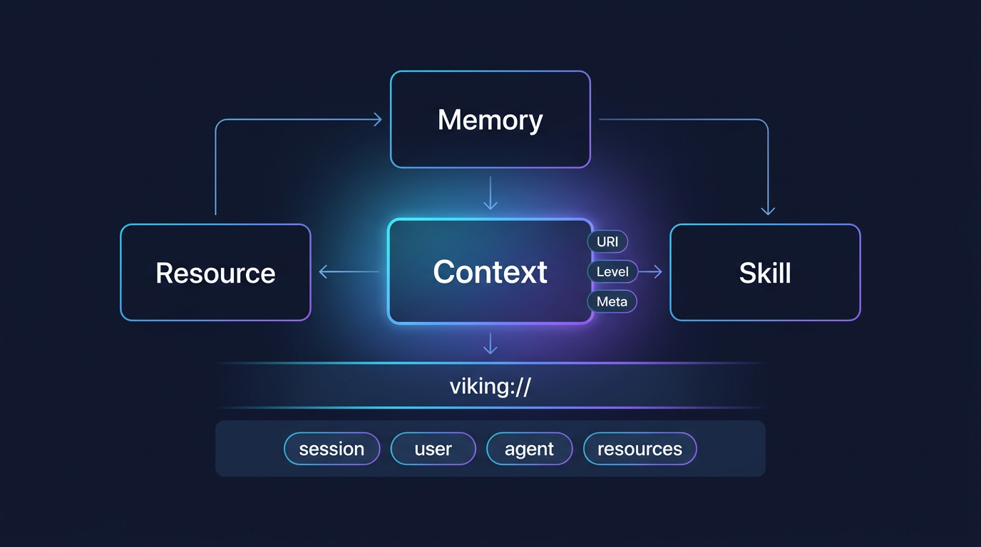 OpenViking 的核心动作,是把 resource、memory、skill 都统一抽象成 Context,放进同一个 viking:// 命名空间里管理。