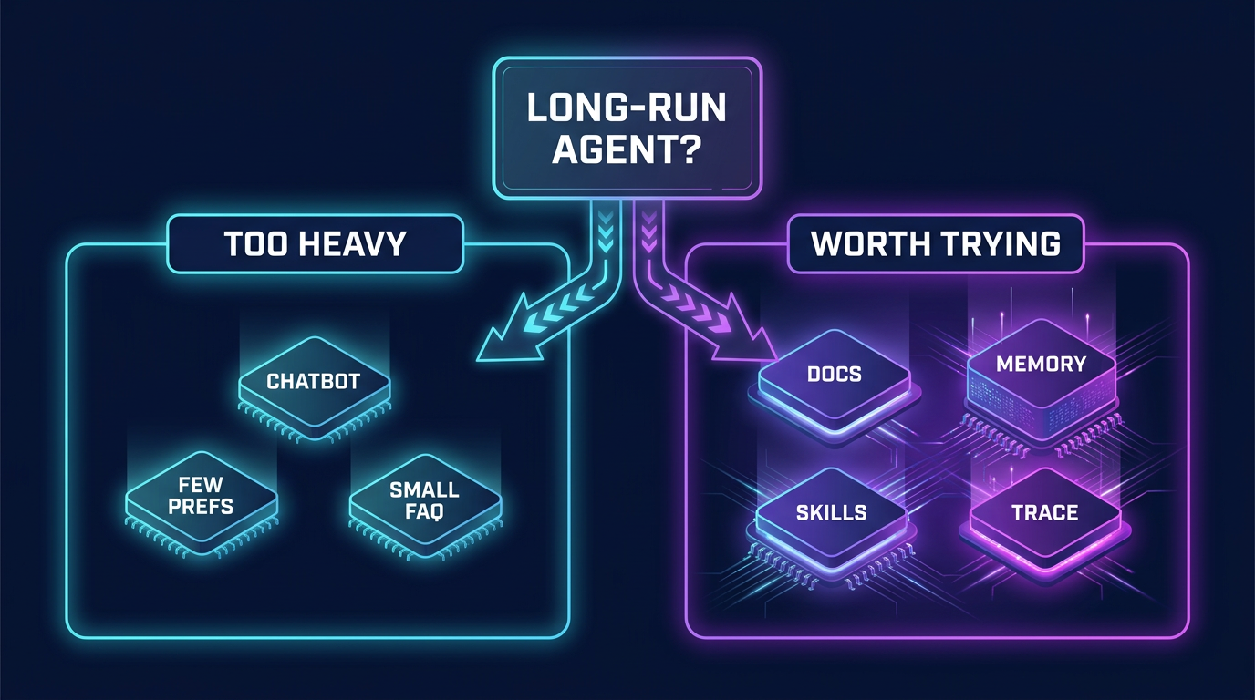 图:这张图回答的其实是“该不该现在就上”。如果你的 Agent 已经跨 session、上下文越来越杂,还要追溯决策过程,那它很值;如果只是轻量聊天或普通知识库问答,先用 memory / RAG 往往更省事。